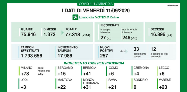 Si conferma il trend di contagi in Lombardia, che anche oggi ha registrato 257 casi positivi, con 7.986 tamponi eseguiti, mentre a Cremona i nuovi contagi rilevati sono 4. Si conferma il trend positivo dei guariti/dimessi (+114), che in totale sono 77.318, di cui 1.372 dimessi e 75.946 guariti. Tornano invece a calare, fortunatamente, i ricoveri, che registrano un -10, mentre quelli in terapia intensiva calano di 3 unità. 4 sono le vittime delle ultime 24 ore.