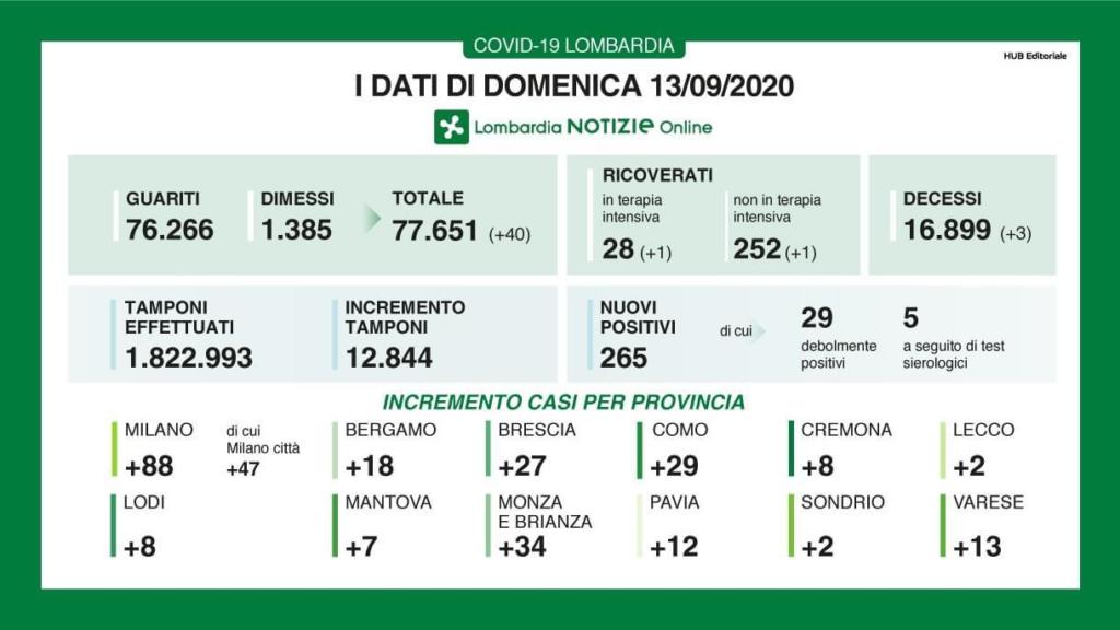 La provincia a far registrare il maggior incremento giornaliero è Milano (+88), seguita da Monza e Brianza (+34) e Brescia (+27). In aumento il numero dei guariti e dimessi (+40, totale 77.651), ma crescono anche il numero dei decessi (tre vittime in più rispetto a ieri) che quello dei ricoverati (+1, totale 252) e di quelli in terapia intensiva (+1, totale 28).