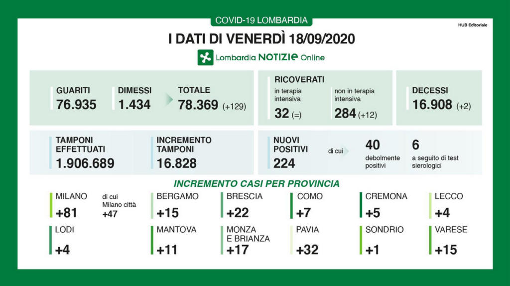 Sono 5 i nuovi casi di coronavirus accertati in provincia di Cremona da parte di Regione Lombardia. In totale, sul suolo lombardo, sono stati registrati 224 nuovi positivi (di cui 40 “debolmente positivi” e 6 a seguito di test sierologico) a fronte di 16.828 tamponi (1,3%). La provincia con più contagi rispetto a ieri è Milano (+81), seguita da Pavia (+32) e Brescia (+22).