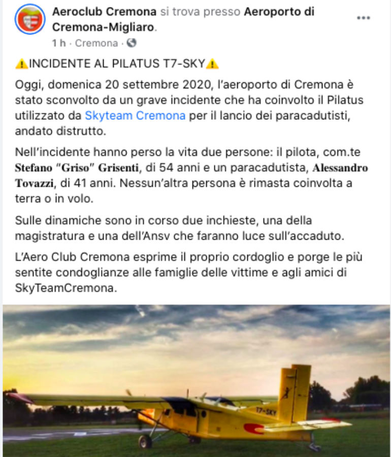 L’AeroClub Cremona, presso l’aeroporto del Migliaro da dove è decollato il velivolo con a bordo altri 5 paracadutisti oltre al pilota, ha postato un messaggio di cordoglio sulla propria pagina Facebook: