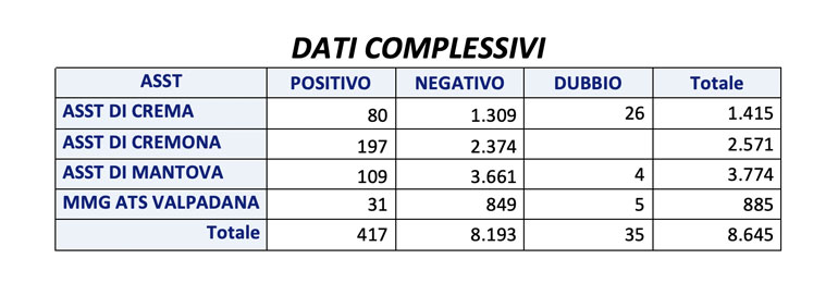 I dati sono stati resi noti dal’Ats della Val Padana, che ha comunicato anche i risultati relativi ai test sierologici rapidi per la ricerca di anticorpi specifici (IgM e IgG) nei confronti del virus SARS-CoV-2, dedicati al personale scolastico docente e non docente e di quello dei servizi educativi per la prima infanzia, eseguiti a partire dal 24 agosto. In particolare sono 3986 i test effettuati tra Cremona e Crema, di cui 277 positivi (80 a Crema e 197 a Cremona) e 26 dubbi.