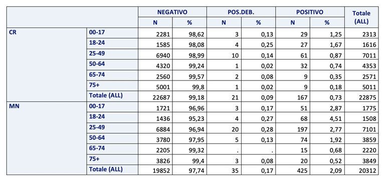Sono stati 22.875 i tamponi elaborati in provincia di Cremona tra il 1 agosto e il 21 settembre, di cui 22.687 sono risultati negativi e solo 167 positivi (lo 0,73%) e 21 debolmente positivi. Guardando alle fasce d’età, la maggior parte dei positivi si concentra nella fascia 25-49 anni, com 61 casi. Segue quella dei 50-64 anni, con 33, poi 0-17 con 29, 18-24 con 27, 65-74 con 9 e altrettanti per gli over 75.