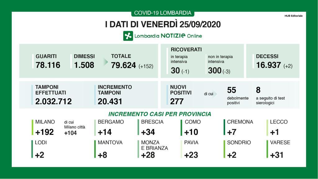 Si ferma il trend positivo: in provincia 7 nuovi contagi 277 i positivi in Lombardia