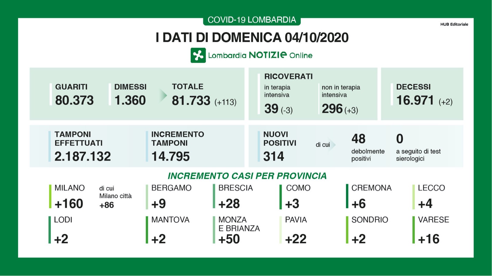Crescono ancora i nuovi casi Covid in Regione, con ben 314 positivi su 14.595 tamponi effettuati, il 2,1%. 48 sono ‘debolmente positivi’. I guariti/dimessi in regione ammontano a 81.733 (+113), di cui 1.360 dimessi e 80.373 guariti; i ricoverati in terapia intensiva 39 (-3); i ricoverati non in terapia intensiva 296 (+3). Due complessivamente i decessi. In provincia di Cremona i nuovi casi di positività sono 6; a Milano 160, di cui 86 a Milano città; nella provincia di Monza Brianza 50, per citare le province più colpite.