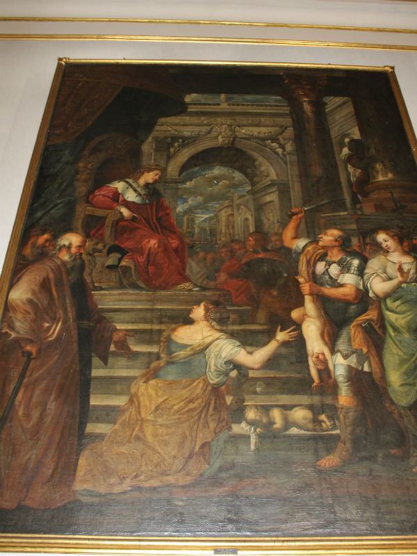 Se però lor signori volessero onorarci di una visita a Palazzo Comunale, saremmo lieti di invitarli nella Sala della Consulta, quella per intendersi dove da anni si ricevono ospiti e si svolgono parte dei progetti realizzati dal Comune per i bambini, onde chiedere, in verità non solo a loro, un illuminato parere sul quadro che sovrasta la Sala da sempre, Il Giudizio di Salomone, dove un neonato viene tenuto per i piedi, nudo a testa in giù da chi brandisce una spada, pronto per essere tagliato a metà.