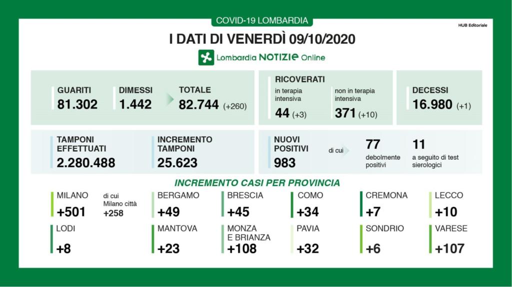 La regione più colpita in queste ultime ore è la Lombardia con 983 nuovi contagi (ieri 683) per un totale di 25.623 tamponi (per una percentuale di 3,8%) . Regge la provincia di Cremona con 7 casi. Nelle province limitrofe, nel milanese sono stati conteggiati 501 casi, di cui 258 a Milano città, Bergamo 49, Brescia 45, Como 34, Lecco 10, Lodi 8, Mantova 23, Monza e Brianza 108, Pavia 32, Sondrio 6, Varese 107. In regione il numero dei ricoverati in terapia intensiva sale di tre e va a quota 44, mentre i ricoveri non in terapia intensiva salgono di 10, arrivando a 371. Un decesso in Lombardia.