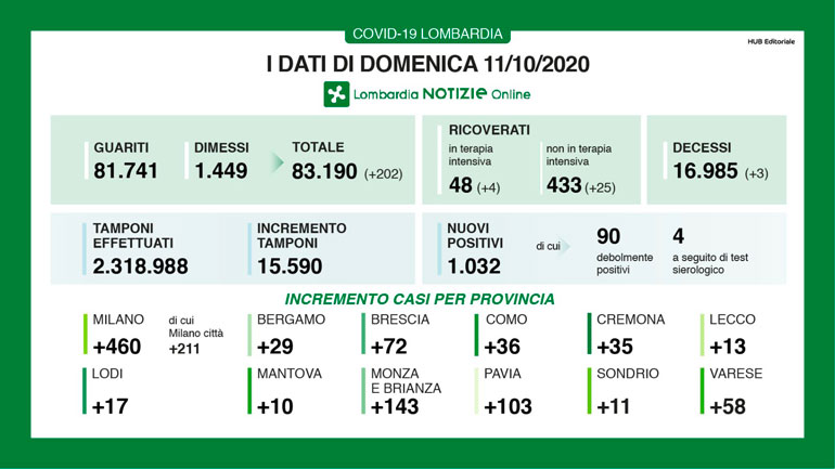 Guardando alle altre province lombarde, è sempre Milano che totalizza il dato peggiore: +460. Seguono Monza e Brianza (+143), Pavia (+103), Brescia (+72), Varese (+58), Como (+36), Bergamo (+29), Lodi (+17), Lecco (+13), Sondrio (+11), Mantova (+10).