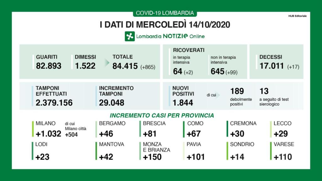 Sono 1.844 i nuovi casi di coronavirus accertati in Regione Lombardia su 29.048 tamponi effettuati: si tratta del 6,34%. In provincia di Cremona sono 30 i nuovi casi positivi (il quarto dato più basso su suolo regionale, ndr), mentre a Milano sono oltre mille (1.032) di cui circa la metà (504) solo nel capoluogo regionale. In aumento inoltre sia i ricoverati (+99) che quelli in terapia intensiva (+2), con un incremento anche di 17 decessi nelle ultime 24 ore. Sono invece 865 i guariti o dimessi in più rispetto a ieri. Numeri che continuano a crescere, dunque, tanto che in Lombardia potrebbero essere introdotte nuove misure restrittive. In questo senso è in programma un incontro in Prefettura alla presenza sia degli esponenti di Regione che degli operatori sanitari. La Lombardia è la Regione ad aver fatto registrare il maggior numero di positivi in Italia, dove in totale sono stati accertati 7.332 nuovi casi su 152.196 tamponi effettuati (4,8%): si tratta del numero di contagiati più alto di sempre. 43 invece, i decessi su tutto il territorio nazionale.