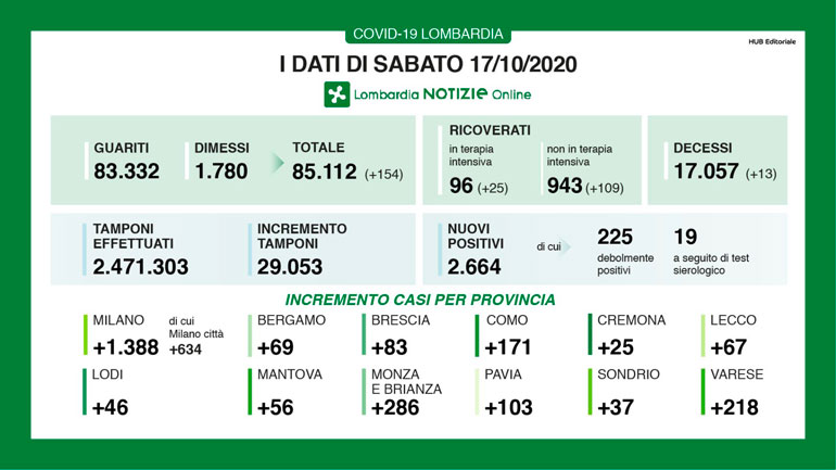 Nelle altre province è sempre Milano a detenere il triste primato, con 1.388 nuovi positivi. Seguono Monza e Brianza (+286), Varese (+218), Como (+171), Pavia (+103), Brescia (+83), Bergamo (+69), Lecco (+67), Mantova (+56), Lodi (+46), Sondrio (37).