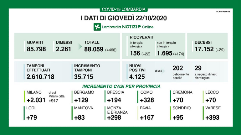 Sono 70 i nuovi casi di positività al coronavirus registrati nella provincia di Cremona nelle ultime 24 ore e ben 4.125 a livello lombardo. I dati, diramati nelle scorse ore dalla Regione, raccontano anche di 174 ricoverati in più nelle strutture sanitarie regionali e di altri 22 pazienti nelle terapie intensive (ora in tutto 156). Una situazione, quindi, in continuo peggioramento, a fronte di 35.715 tamponi processati. Alto anche il numero delle vittime, che risultano essere 29 nelle ultime 24 ore. Record di positivi a livello nazionale, dove si sono registrati 16.079 casi.