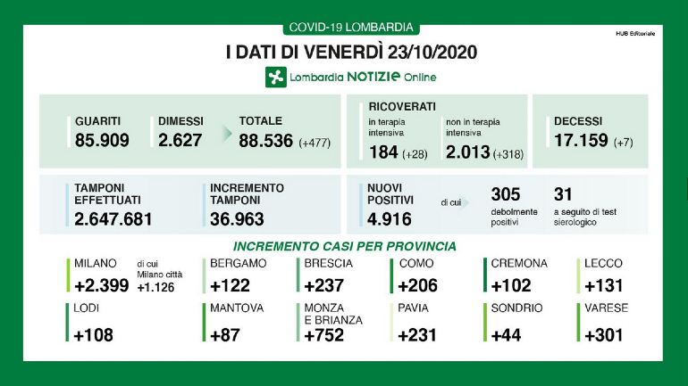 Sono 102 i nuovi casi positivi accertati in provincia di Cremona dal Ministero della Salute. In totale, in Lombardia, sono quasi 5mila i nuovi contagi dichiarati dal Ministero: 4.916, di cui 305 “debolmente positivi” e 31 a seguito di test sierologico. 36.963 i tamponi processati, con la percentuale dei posivi che si attesta quindi al 13,2%. La provincia più colpita rimane Milano (2.399), ma salgono vertiginosamente anche i dati relativi a Monza e Brianza (752). Su suolo nazionale, invece, sono 19.143 i nuovi positivi su 182.032 tamponi effettuati, un nuovo record. La percentuale dei positivi in Italia è dunque del 10,5%. Nel Paese, nelle ultime 24 ore, si sono registrati altri 91 decessi, di cui 7 in Lombardia. In Italia sono state invece 2.352 le persone dimesse, mentre crescono anche i ricoverati con sintomi (+855) e quelli in terapia intensiva (+57). In Regione, invece, sono stati 477 i guariti o dimessi in più rispetto a ieri, ma crescono anche i ricoverati (+318, totale 2.013) e quelli in terapia intensiva (+28, totale 184).