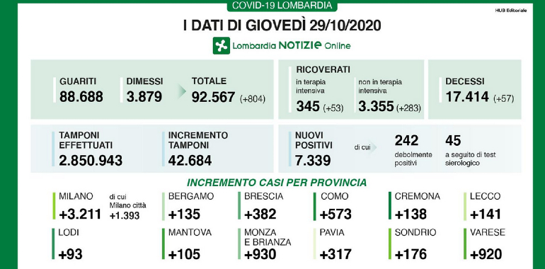 La Lombardia rimane la Regione più colpita, con la provincia di Milano che fa registrare 3.211 nuovi casi, di cui 1.393 in città. Sopra i 900 anche Monza e Brianza (930) e Varese (920). A seguire, tra le Regioni, Campania (3.103), Piemonte (2.585) e Veneto (2.109). Sono 3.878 i nuovi guariti o dimessi nel Paese, di cui 804 in Lombardia, mentre i decessi in Italia sono stati 217, di cui 57 su suolo lombardo. Per quanto riguarda gli ospedali, in Regione, sono 283 i ricoverati in più rispetto a ieri e 53 la crescita di quelli in terapia intensiva.