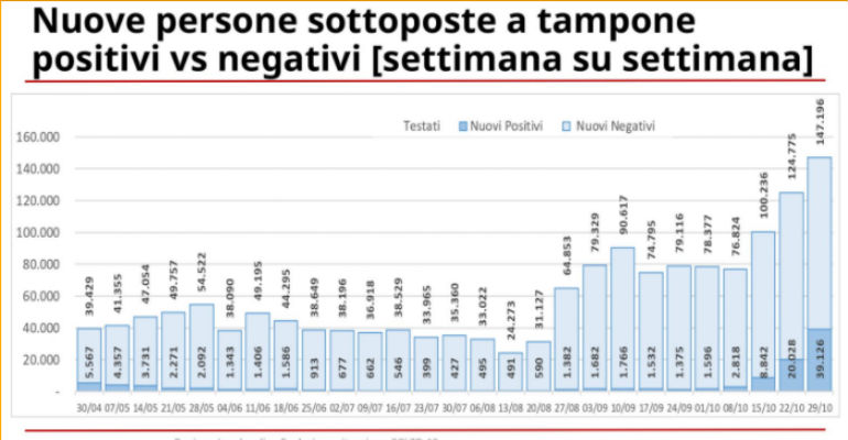 La percentuale dei casi positivi sul numero di tamponi efficaci (positivi + negativi) supera il 19% e anche la percentuale di tamponi positivi per le persone «nuove» sottoposte al test sale oltre il 26,5%. Non si rilevavano valori simili da aprile!