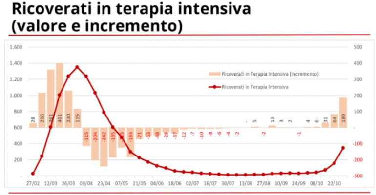 Il numero dei ricoverati (sia in terapia intensiva che non) cresce esponenzialmente rispetto alle ultime settimane (siamo oggi a 345 ricoverati in terapia intensiva, rispetto ai 156 della settimana scorsa e ai 72 di quella precedente)”.