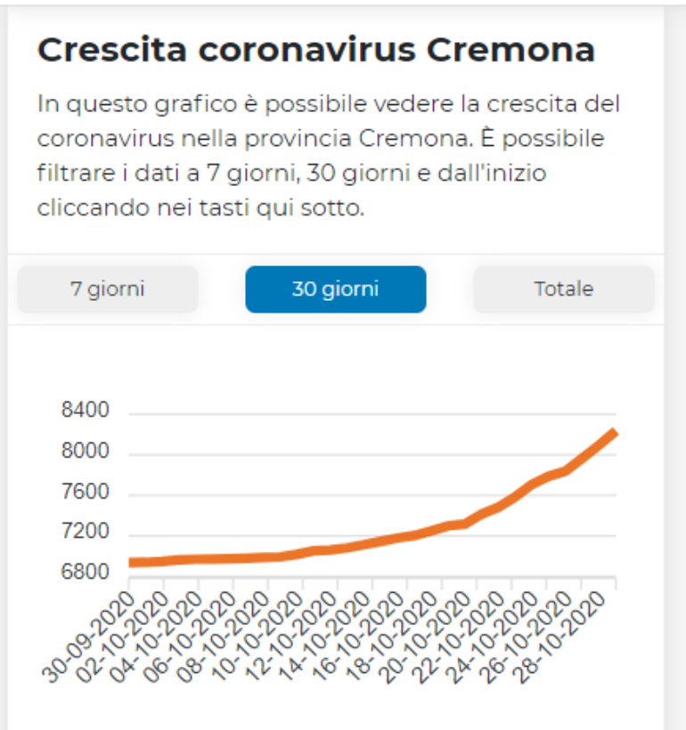 La provincia di Cremona non è tra le peggiori in Lombardia, con una crescita di contagi quantificata attorno al 1500%, cioè tra le dieci e le quindici volte il valore di riferimento (ossia i casi positivi a fine settembre). Al 30 settembre i positivi totali erano 6937; al 29 ottobre 8.235, con una crescita di 1.298 unità, pari al 16%. Molto peggiore la situazione nelle province di Varese, Como e Lodi, con incrementi di circa il 20%; incrementi contenuti tra il 5 e il 10% invece a Brescia. Bergamo Sondrio, Mantova e Pavia.