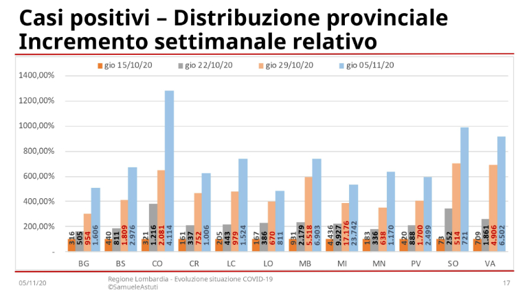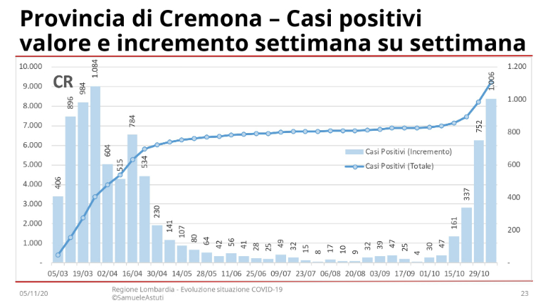 Sono cresciuti di oltre il 600% i numeri del Covid in Provincia di Cremona: a dirlo è il report settimanale compilato dal consigliere regionale dem Samuele Astuti. Secondo quanto rilevato, l’andamento crescente riguarda tutte le province lombarde, ma con diverse velocità: crescita tra il 400% e il 600%, cioè 4/6 volte il valore di riferimento a Bergamo, Lodi, Milano e Pavia; crescita tra il 600% e l’800%, cioè 6/8 volte il valore di riferimento a Brescia, Cremona, Lecco, Monza e Mantova); crescita oltre l’800%, cioè più di 8 volte il valore di riferimento a Como, Sondrio e Varese).
