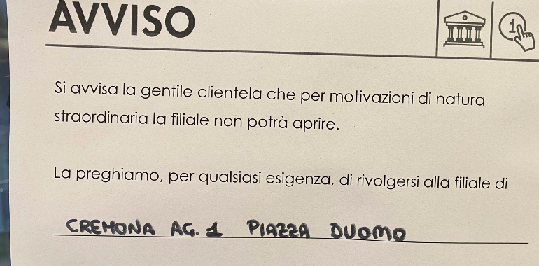 Un cartello, apposto presso la sede di via Cesare Battisti della Banca Popolare di Cremona, avvisa i clienti che la sede rimarrà chiusa “per motivazioni di natura straordinaria”. All’interno del personale dell’istituto, infatti, è stato registrato un caso di positività al coronavirus. Subito sono scattate tutte le misure previste dai protocolli, anche se la collega risultata positiva era stata al lavoro in via Battisti il 30 ottobre, quindi nessun allarme perché erano già passati 14 giorni da possibili altri contagi. La banca, per sicurezza, ha comunque approfittato della ricorrenza di Sant’Omobono, caduta ieri, venerdì 13 novembre, per effettuare anche tutte le operazioni di sanificazione. Rimasta chiusa anche nella giornata di oggi, la sede riaprirà comunque regolarmente già nella giornata di lunedì 16 novembre.