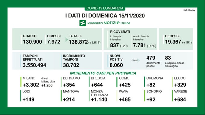 Sono 82 i nuovi casi positivi riscontrati oggi in provincia di Cremona, il numero più basso di tutta la Regione. 8.060 quelli registrati in Lombardia, su 38.702 tamponi effettuati, quindi con una percentuale di positivi del 20.8 (ieri 22,8%). Salgono di 20 i ricoveri in terapia intensiva in Regione  e raggiungono quota 837. Altri 160 i ricoveri ordinari (ora sono 7.781). Purtroppo molto alto il numero dei decessi, 181 (ieri 158) per un totale di 19.367 morti in Regione dall’inizio della pandemia. Milano continua ad essere pesantemente colpita dai contagi:  3.302 nell’Area Metropolitana di cui 1.266 a Milano città; 644 a Brescia, 354 a Bergamo, 1.140 a Monza e Brianza, 684 a Varese: il nord della Lombardia si conferma l’area a maggiore impatto del virus.