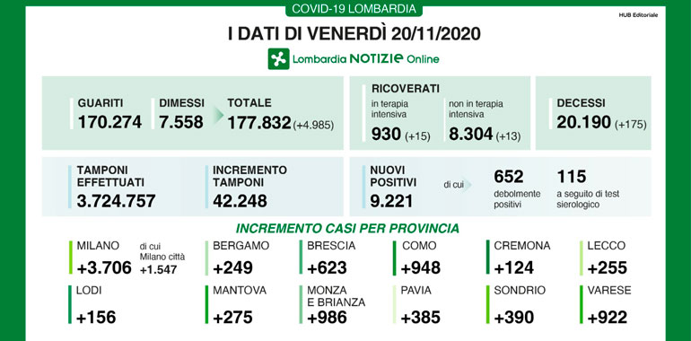 Sono 124 i nuovi casi di positività al Covid-19 in provincia di Cremona, mentre nel complesso la Lombardia ne conta 9.221 a fronte di 42.248 tamponi effettuati (21,8% di positività). Riprende a crescere la curva dei ricoverati, +13 (8.304 in totale), ma ancora di più crescono i pazienti in terapia intensiva (+15), che salgono a 930. Si aggrava ancora anche il bilancio delle vittime, +175, che da inizio pandemia sono 20.190.
