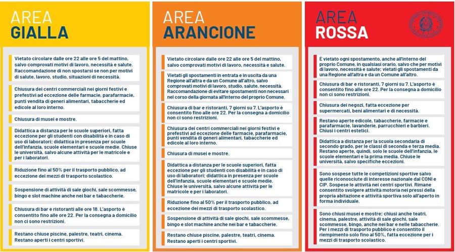 Passare da zona rossa ad arancione cambierebbe un po’ di cose, ma non per bar e ristoranti che resterebbero chiusi, anche se con asporto consentito. Cambierebbe un poco la mobilità delle persone, con la possibilità di uscire di casa (ma non spostarsi dal proprio comune né tantomeno dalla regione). Potrebbero aprire i negozi di non prima necessità (ad esempio abbigliamento) oggi chiusi, e anche i centri commerciali, con esclusione dei fine settimana.