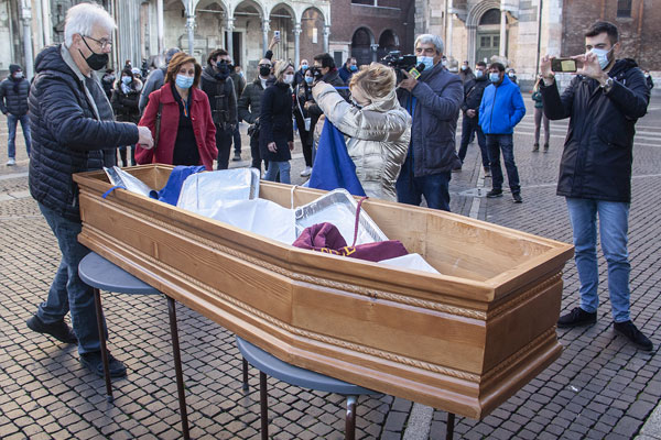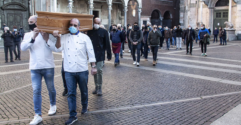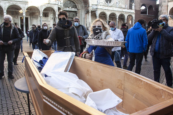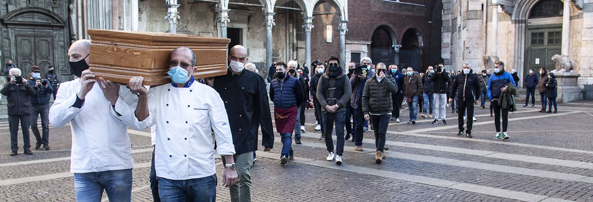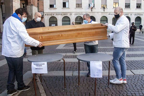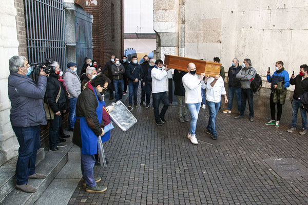Una bara che, partendo da dietro il Battistero, è stata portata in corteo verso il Comune e poi riempita con una serie di oggetti; chi ha buttato dentro grembiuli, chi teglie, pentole, posate, chi addirittura le chiavi del proprio locale: un funerale in piena regola, insomma. Quello delle attività commerciali del territorio cremonese, che stanno ormai agonizzando a seguito dell’introduzione delle ultime misure anti contagio volute nell’ultimo Dpcm firmato dal premier Conte.