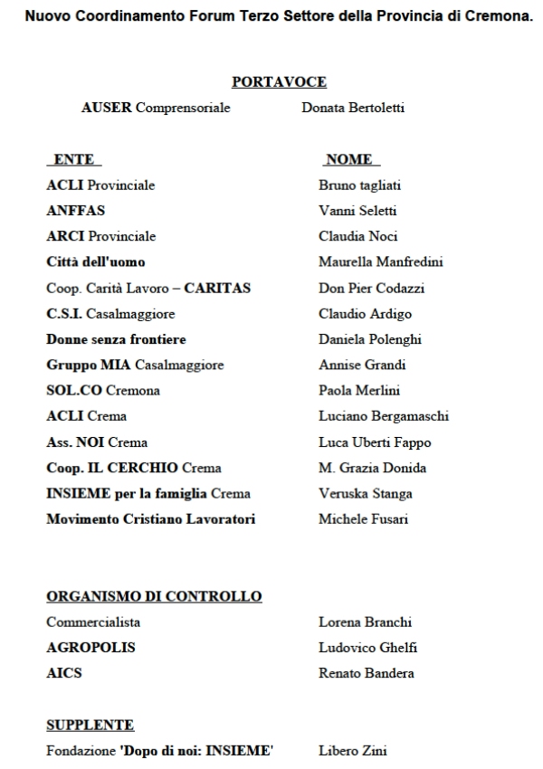 Associazioni e Cooperative iscritte al Forum dell’intero territorio provinciale, hanno accolto e approvato la proposta della portavoce uscente Daniela Polenghi per eleggere i 14 componenti e i nuovi revisori dei conti, del nuovo coordinamento provinciale.