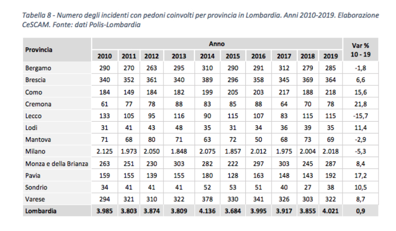 IL COINVOLGIMENTO DEI PEDONI – Nell’arco di quasi un decennio, dal 2010 al 2019, in provincia sono aumentati di quasi il 22% gli incidenti che coinvolgono pedoni, un incremento altissimo, il più alto di tutta la Lombardia e ben al di sopra della media lombarda. E purtroppo molti di questi si rivelano mortali: il tasso di mortalità stradale (ossia il rapporto tra il numero dei morti in incidenti stradali e la popolazione media dello stesso periodo) mostra i valori più elevati nelle province di Como, di Cremona e di Sondrio (rispettivamente 1,82, 1,67 e 1,66).