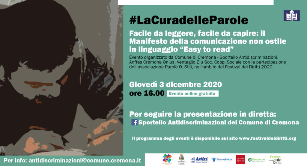 Giovedì 3 dicembre alle ore 16.00, in occasione della Giornata Internazionale delle Persone con Disabilità, si terrà l’incontro ‘La Cura delle Parole’ durante il quale verrà presentato il Manifesto della comunicazione non ostile nella traduzione in linguaggio Easy to Read – facile da leggere e da capire. L’evento è organizzato dal Comune di Cremona – Sportello Antidiscriminazioni, Anffas Cremona Onlus, Coop. Sociale Ventaglio Blu, con la partecipazione di Parole O_Stili, l’associazione triestina che ha dato vita al Manifesto e ne promuove la diffusione.