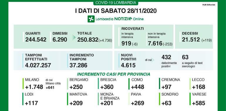 Continua il trend di miglioramento della situazione in Lombardia, dove diminuiscono i ricoverati sia nei reparti (-253) che in terapia intensiva (-6). Il numero dei tamponi effettuati è 37.286 e 4.615 sono i nuovi positivi (12,3%). In provincia di Cremona sono invece 97 i nuovi casi. Ancora numerose, purtroppo, le vittime, 119 in tutta la Regione, per un totale complessivo di 21.512.