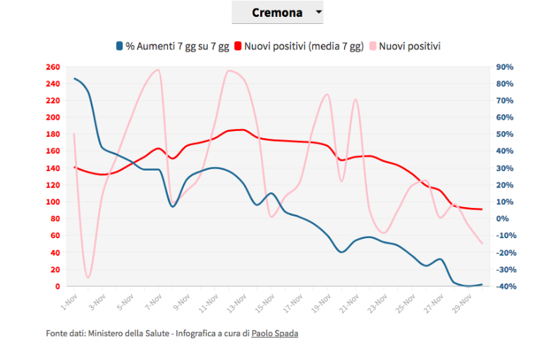 Quasi un’oasi felice, ben lontano da tinte rosse o arancioni, in un nord-Italia dove i numeri sono ancora molto elevati: l’incidenza dei contagi nelle ultime due settimane nelle provincie di Bergamo, Cremona e Brescia disegna infatti una situazione ben più tranquilla di quella del resto della Regione. In particolare nel Cremonese tra il 15 e il 30 novembre i nuovi positivi sono 233 ogni 100mila abitanti. Situazione ancora migliore a Bergamo, dove l dato è di 123 ogni 100mila abitanti, e Brescia con 200. Numeri molto più alti nei territori limitrofi, con picchi tra Varese (670) Como (652) e Sondrio (602).