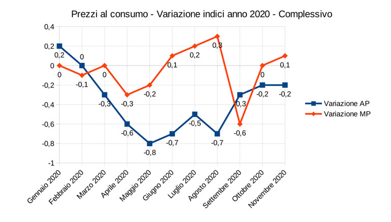 Continua a essere molto variabile la tendenza dei prezzi al consumo sul nostro territorio, probabilmente a causa della pandemia in corso. In novembre spicca ad esempio un forte calo, -7,5%, del costo dell’istruzione, rispetto allo scorso anno (mentre resta invariata dal mese precedente). Allo stesso modo, calano di molto anche le spese relative alla comunicazione, che registrano un -6,5% (-0,6% su base congiunturale). Calano altresì anche le spese per l’abitazione e le relative bollette (-1,6% tendenziale).