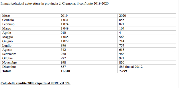 L’ultimo mese dell’anno certifica il crollo delle vendite di automobili in tutta Italia, con un calo ancora più marcato che interessa la provincia di Cremona. Secondo le ultime stime, infatti, a fine 2020 le immatricolazioni di auto in Italia difficilmente supereranno la cifra di 1,4 milioni, con un calo del 26% rispetto allo scorso anno, quando furono 1,9 milioni. Nel Cremonese, nel 2020 sono state vendute ed immatricolate 7.799 auto (dato aggiornato al 29 dicembre), contro le 11.318 del 2019. La contrazione è stata quindi del 31,1%.