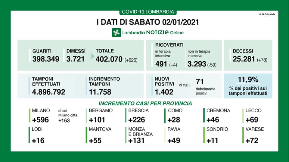 46 nuovi positivi in provincia di Cremona, oggi, 2 gennaio. In tutta la Regione i nuovi positivi sono 1.402 su 11.758 tamponi eseguiti, l’11,9%, un dato in crescita. 78 i decessi in Regione; 626 i malati giudicati guariti e quelli dimessi dagli ospedali. Quattro i nuovi ricoveri in terapia intensiva, mentre diminuiscono di 59 unità i ricoveri ordinari. Milano è sempre la provincia con il maggior numero di nuovi contagi (+596) seguiti da Brescia e Monza Brianza.