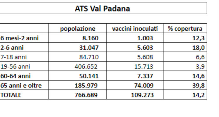 Solo il 14,2% dei residenti nell’Ats Valpadana (province di Cremona e Mantova) hanno ricevuto la vaccinazione antinfluenzale. E la popolazione che doveva essere in cima alla lista delle priorità, ossia gli ultra65enni, l’hanno ricevuta solo nel 40% dei casi. Sono i dati forniti direttamente dalla Regione Lombardia al consigliere regionale Pd Matteo Piloni, che oggi li ha diffusi e commentati.