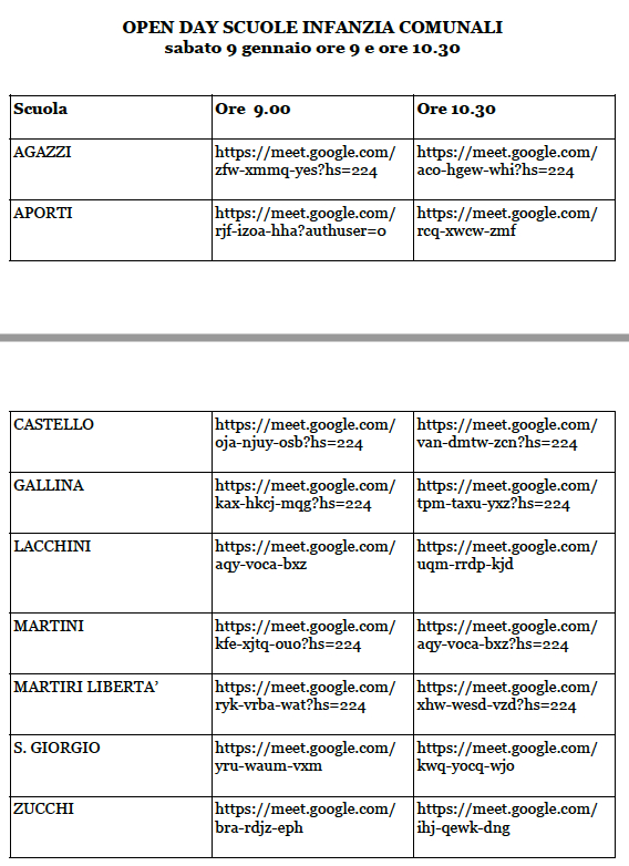Inoltre tutte le nove scuole d’infanzia comunali propongono per la mattina di sabato 9 gennaio, un open day dedicato alle famiglie con lo scopo di far conoscere ambienti, spazi e organizzazione della giornata educativa. In base alle norme di prevenzione e di contenimento del contagio da Covid-19, gli incontri si terranno in modalità a distanza sulla piattaforma google meet. Per offrire la