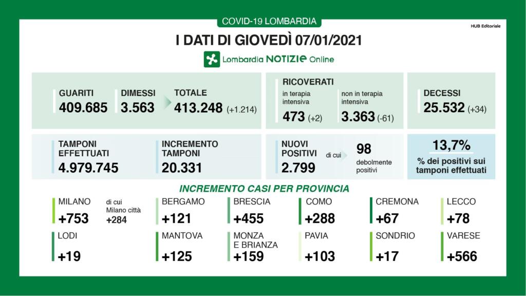 Sono 67 i nuovi contagi da Covid in provincia di Cremona per un numero di tamponi di 20.331. L’indice di contagio è al 13,7%. 2.799 i casi in Lombardia, di cui 98 debolmente positivi. Salgono di 2 unità i ricoveri in terapia intensiva per un totale di 473, mentre scendono di 61 unità i ricoveri negli altri reparti per un totale di 3.363 ricoverati. I decessi sono 34. Per quanto riguarda le altre province: Milano registra 753 contagi, di cui 284 in città, Bergamo 121, Brescia 455, Como 288, Lecco 78, Lodi 19, Mantova 125, Monza e Brianza 159, Pavia 103, Sondrio 17 e Varese con 566. I guariti/dimessi sono 1.214. In Italia i nuovi casi sono 18.020, i morti 414. Oggi sono stati effettuati 121.275 tamponi. Il tasso di positività risale al 14,9%. I ricoveri crescono di 117 unità, a quota 23.291, le terapie intensive di 16, a quota 2.587.