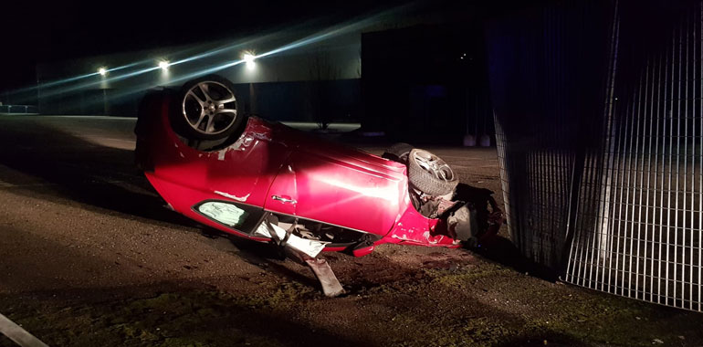 I freni non funzionano: sfonda la recinzione della Fiera e si ribalta. Giovane illeso