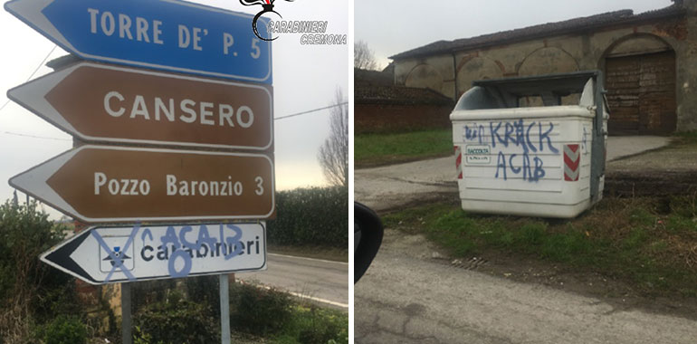 La “noia” e la ricerca di forti emozioni probabilmente, ancora una volta, sono all’origine degli episodi contestati. Le indagini di Polizia Giudiziaria condotte dai Carabinieri, che sono tutt’ora in corso per alimentare ulteriormente il quadro probatorio, hanno permesso di identificare i due responsabili, i quali avevano imbrattato alcuni cartelli stradali e cassonetti con svariate scritte e disegni effettuati con vernice spray e tra queste anche una di tono offensivo nei confronti dell’Arma dei Carabinieri.