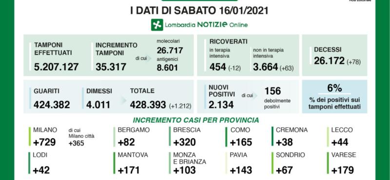 Per quanto riguarda le altre province: Milano registra 729 contagi, di cui 365 in città, Bergamo 82, Brescia 320, Como 165, Lecco 44, Lodi 42, Mantova 171, Monza e Brianza 103, Pavia 143, Sondrio 67 e Varese con 179. I guariti/dimessi sono 1.212.