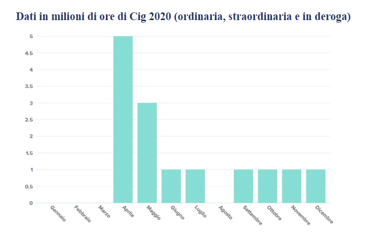 Tornando allo scorso anno, dopo un avvio sostanzialmente in linea con gli anni precedenti (109mila ore in gennaio e 245mila in febbraio), il maggiore ricorso alla cassa è stato fatto nei mesi di aprile (5,21 milioni di ore) e di maggio (3,04 milioni), mentre nei mesi successivi il valore è sempre stato superiore ad un milione di ore per mese, con l’eccezione di agosto (520mila ore).
