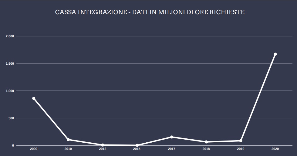 Perfino gli anni della grande crisi seguita al crollo finanziario iniziato con la chiusura di Lehman Brothers, pur caratterizzati da un forte ricorso alla cassa, si erano chiusi con dati lontani da quelli del 2020: erano state infatti chieste in provincia 8,92 milioni di ore nel 2009 e 10,7 nel 2010.
