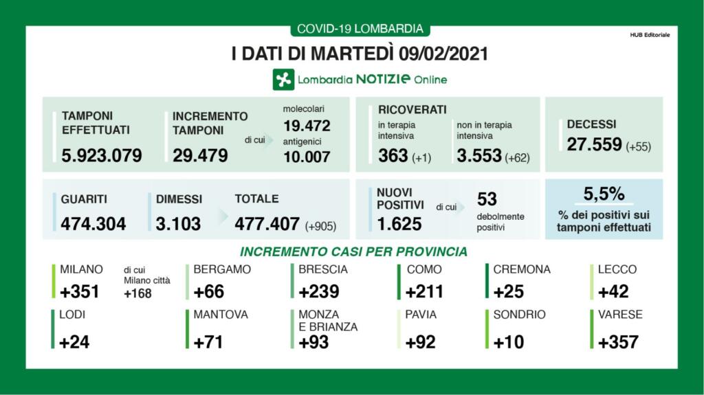 Per quanto riguarda le altre province: Milano registra 351 contagi, di cui 168 in città, Bergamo 66, Brescia 239, Como 211, Lecco 42, Lodi 24, Mantova 71, Monza e Brianza 93, Pavia 92, Sondrio 10 e Varese con 357. I guariti/dimessi sono 905.
