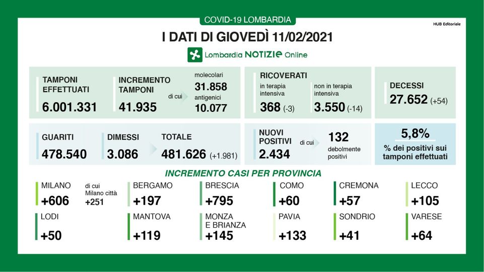 Altri 57 positivi oggi in provincia di Cremona, mentre in Regione aumentano di 2.434 su 41.935 tamponi effettuati, quindi il 5,8%.