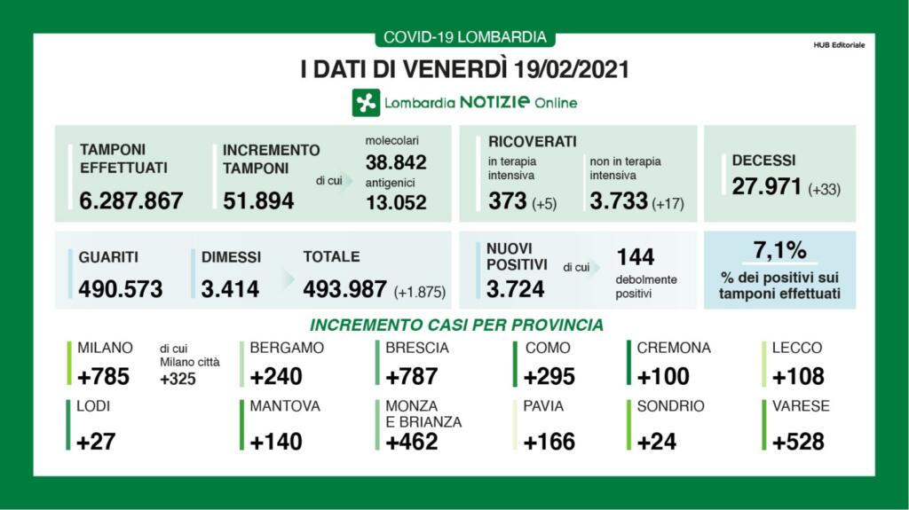 Per quanto riguarda le altre province: Milano registra 785 contagi, di cui 325 in città, Bergamo 240, Brescia 787, Como 295, Lecco 108, Lodi 27, Mantova 140, Monza e Brianza 462, Pavia 166, Sondrio 24 e Varese con 528. I guariti/dimessi sono 1.875.
