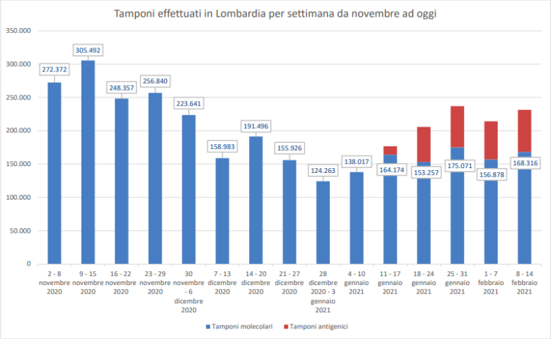 Oggi stiamo facendo ogni settimana almeno 100mila tamponi molecolari in meno di novembre ed è un problema. Confidiamo che l’assessore Moratti e tutte le forze politiche colgano la necessità di ripristinare almeno il livello di tracciamento che la Lombardia è stata in grado di dispiegare solo tre mesi fa. Meno tamponi molecolari significa maggior libertà di circolazione per il virus che tutti vogliamo combattere”.