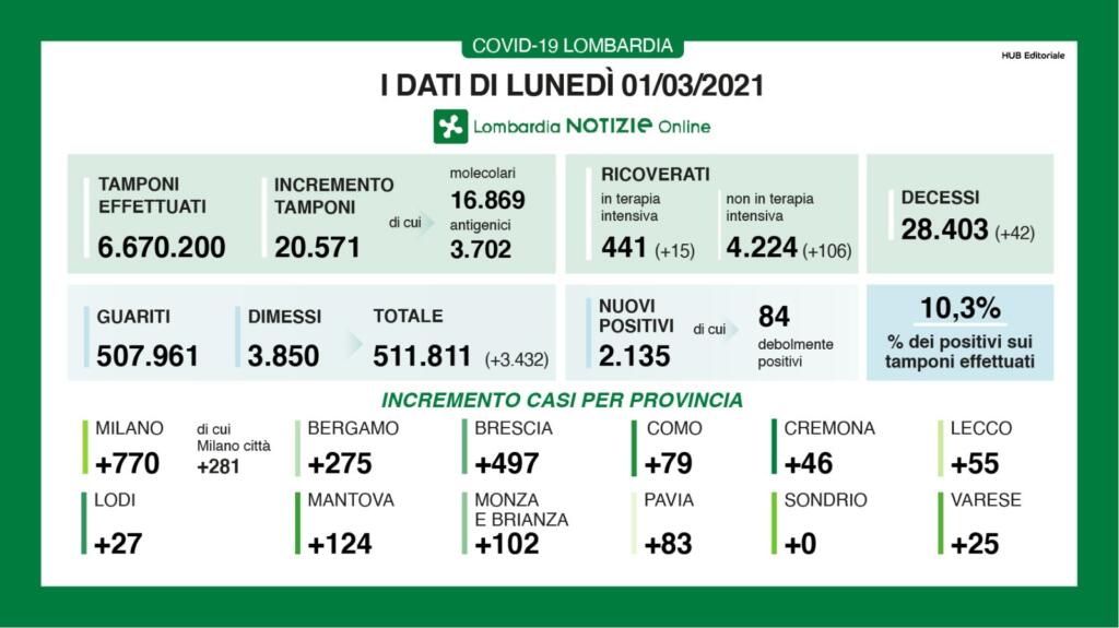 Sono 2.135 i nuovi casi di Coronavirus registrati in Lombardia nelle ultime 24 ore a fronte di 20.571 tamponi effettuati. 42 i decessi. Aumentano ancora sia i ricoveri in ospedale (più 106 per un totale di 4.224) sia il numero di persone ricoverate in terapia intensiva: sono 441 (più 15 rispetto a ieri). L’indice di contagio è al 10,3%.