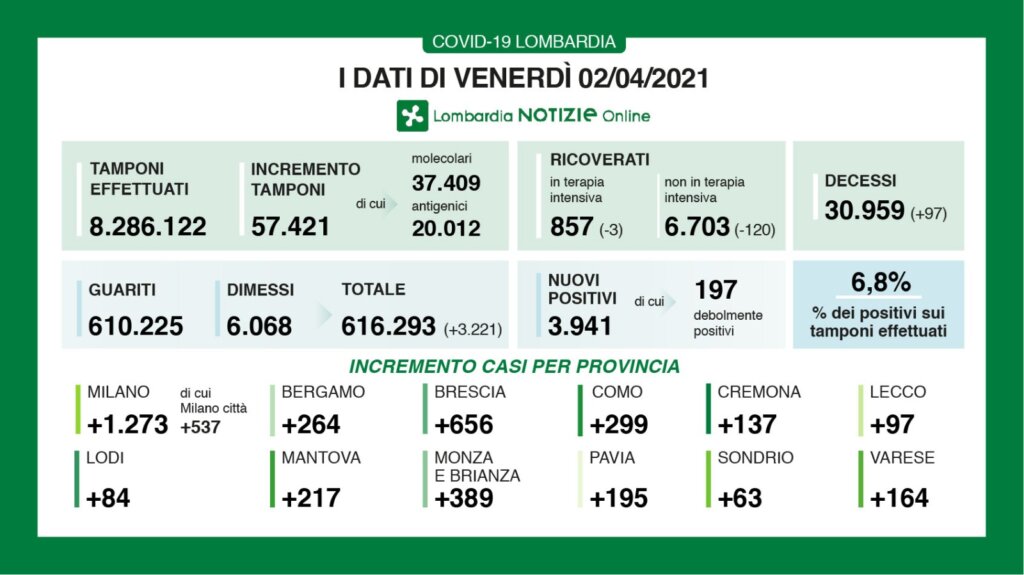 Per quanto riguarda le altre province, Milano 1.273, di cui 537 in città, Bergamo 264, Brescia 656, Como 299, Lecco 97, Lodi 84, Mantova 217, Monza e Brianza 389, Pavia 195, Sondrio 63 e Varese 164.