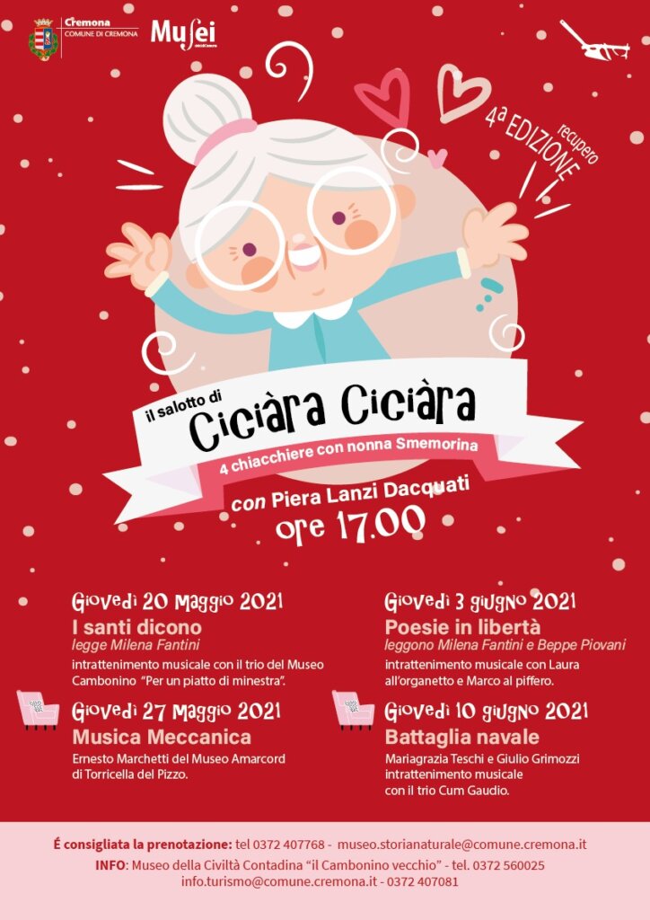 Riprende al Museo della Civiltà Contadina “Il Cambonino vecchio” il ciclo di incontri “Ciciàra ciciàra – Quattro chiacchiere con nonna Smemorina” a cura di Piera Lanzi Dacquati. Viene così recuperata la quarta edizione che, a causa della pandemia, lo scorso anno non si era potuta svolgere.