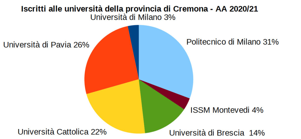 Gli studenti cremonesi frequentano per lo più l’Università Cattolica del Sacro Cuore (32%) e a seguire il Politecnico di Milano (21%), l’Università degli studi di Pavia (20%), l’Università degli Studi di Brescia (19%) e solo il 4% l’Università degli Studi di Milano e l’Istituto Superiore di StudiMusicali “Monteverdi”. Gli studenti residenti fuori provincia frequentano invece il Politecnico di Milano (36%), l’Università degli studi di Pavia (30%), l’Università Cattolica del Sacro Cuore (17%), l’Università degli Studi di
