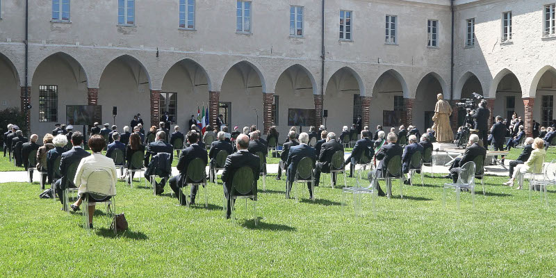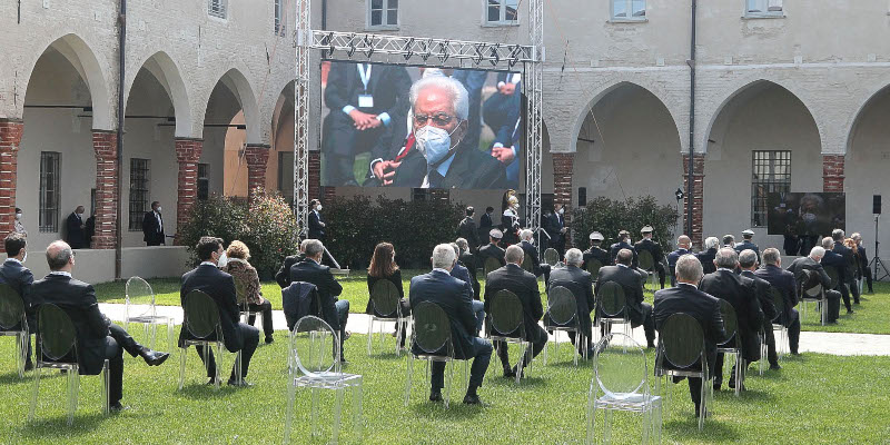 E’ stata quindi la volta del Presidente Mattarella, che si è complimentato “per questo splendido recupero e per questo sforzo collettivo. I Monasteri, nell’Alto Medioevo, erano propulsori della rinascita, e per questo essere qui ha un significato simbolico. Questo straordinario complesso si è trasformato in un suggestivo campus frutto di collaborazione tra pubblico e privato. Condizione preziosa anche in via generale, non soltanto in questa circostanza: particolarmente in questo momento la collaborazione fra tutte le realtà del Paese è indispensabile per definire nel modo migliore, per attuare sollecitamente e con efficienza i programmi che conseguono dal Next Generation dell’Unione Europea.